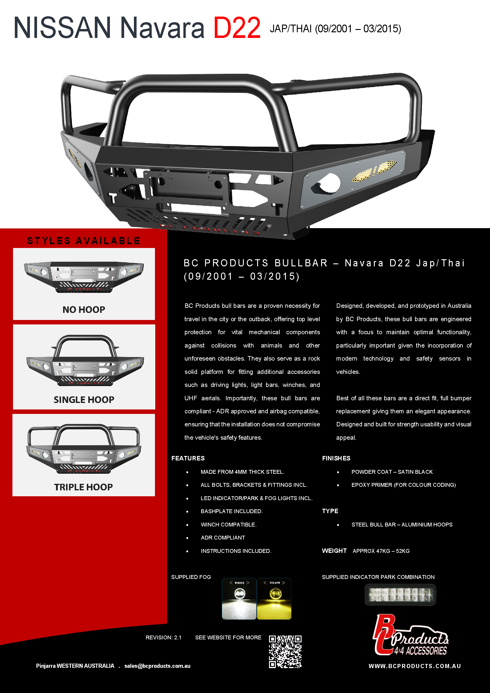 BC Products bull bars are a top quality full bumper replacement bull bar. This is the triple hoop version for Nissan Navara D22. Built and designed for strength and appeal and comes ADR Approved and Airbag Compatible.
