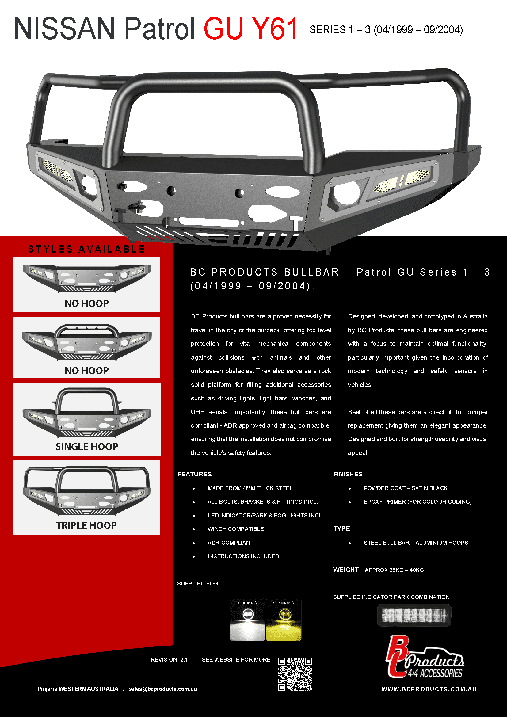 BC Products bull bars are an innovative high quality full bumper replacement bull bar. This is the triple hoop version for Nissan Patrol GU Y61 Series 1 to 3. Built and designed for strength and appeal and comes ADR Approved and airbag/winch Compatible.